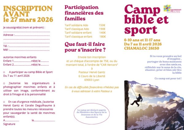 Si tu veux prendre un bol d'oxygène, partager de bons moments avec des amis.es, réfléchir sur le sens de la vie, chanter, prier et bien sûr lire la bible : ce camp est pour toi !