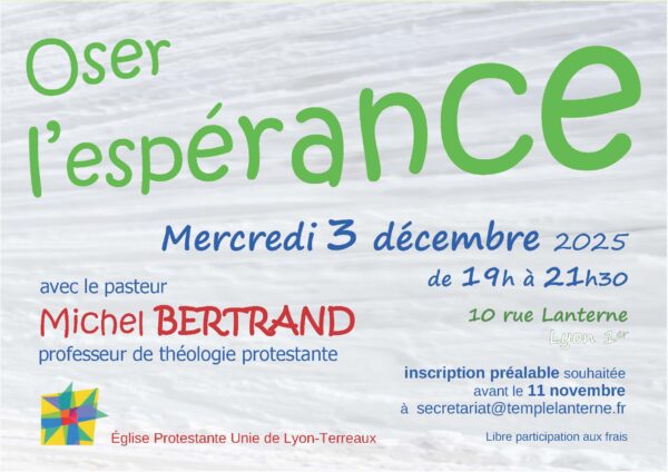 "Oser l’espérance », tel est le thème de la conférence-débat proposée par pasteur et professeur de Théologie Michel Bertrand ; une façon de vivre le temps de l'Avent sous le signe de l’espérance.
