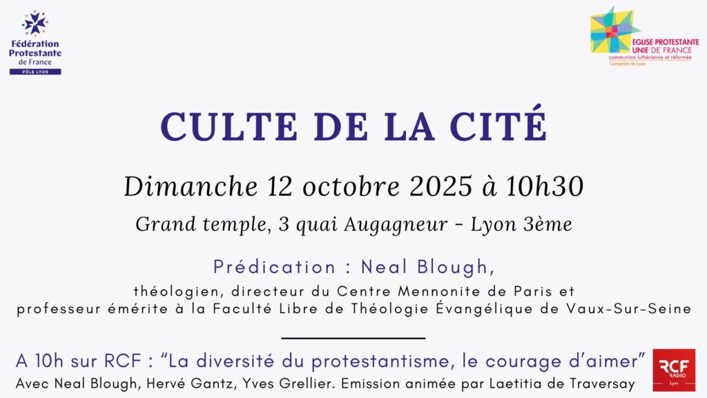 Le culte sera précédé, à 10h sur RCF, d’une émission intitulée : « La diversité du protestantisme, le courage d’aimer », animée par Laetitia de Traversay, avec Neal Blough, Hervé Gantz et Yves Grellier.