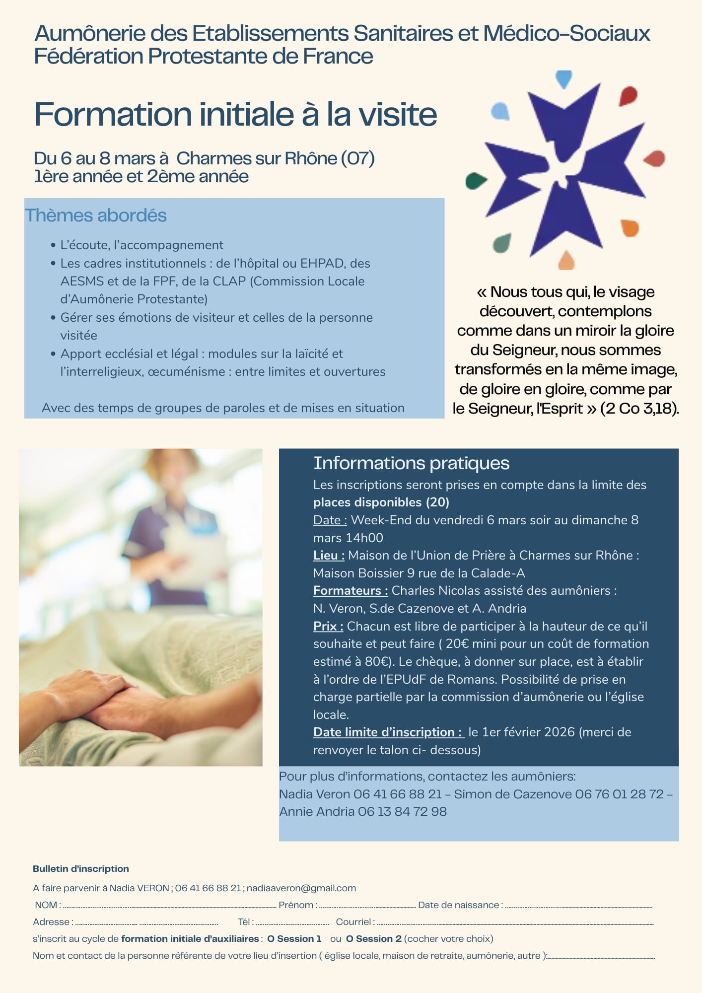 Comme depuis deux ans, plusieurs aumôniers des hôpitaux de la région Auvergne Rhône-Alpes organisent un week-end de formation pour les auxiliaires (visiteurs) bénévoles en aumônerie d’hôpital et Ehpad.