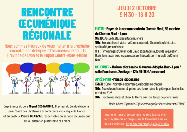 Nous sommes heureux de vous inviter à la prochaine rencontre des délégués à l’œcuménisme pour la Province de Lyon et la Région Centre-Alpes-Rhône
