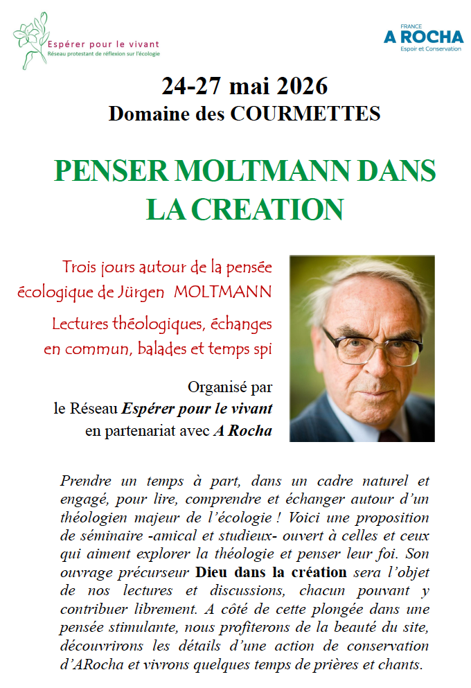 Prendre un temps à part, dans un cadre naturel et engagé, pour lire, comprendre et échanger autour d’un théologien majeur de l’écologie ! Voici une proposition de séminaire – amical et studieux – ouvert à celles et ceux qui aiment explorer la théologie et penser leur foi. Son ouvrage précurseur Dieu dans la création sera l’objet de nos lectures et discussions, chacun pouvant y contribuer librement. À côté de cette plongée dans une pensée stimulante, nous profiterons de la beauté du site, découvrirons les détails d’une action de conservation d’ARocha et vivrons quelques temps de prières et chants.